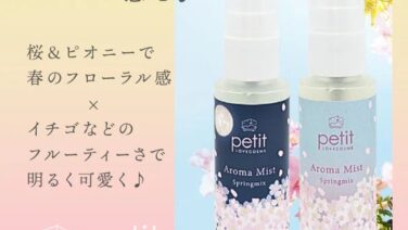 個数限定「ラブコスメプチ アロマミスト(スプリングミックス)」をご紹介!桜とピオニーの優しいフローラル感に、イチゴなどのフルーティーさが合わさった明るく可愛い春の香りです。持ち運びに便利なサイズで、いつでも春の訪れのワクワク感を♪