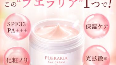 忙しい朝のUV対策・保湿・ハリつやケアがこれ1つ!「プエラリア デイクリーム(SPF33 PA+++)」を徹底レビュー。光拡散効果でくすみをカバーし、デートにぴったりの上質なツヤ肌を演出します。時短でキレイを叶えたい女性必見の限定アイテムです。