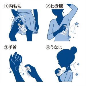 ※香りは下から上へ立ち昇る性質があるので、太ももやウエストに付けると、彼と抱き合った時にふわっと香って効果的です!