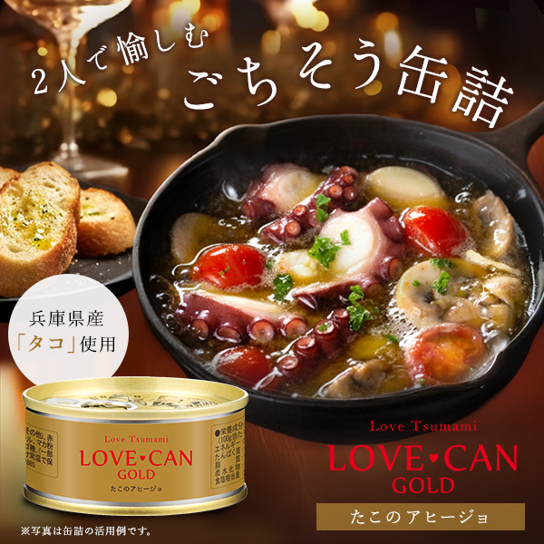 『ラブ缶 GOLD~たこのアヒージョ~』は、兵庫県産の国産タコを使ったご褒美アヒージョです。