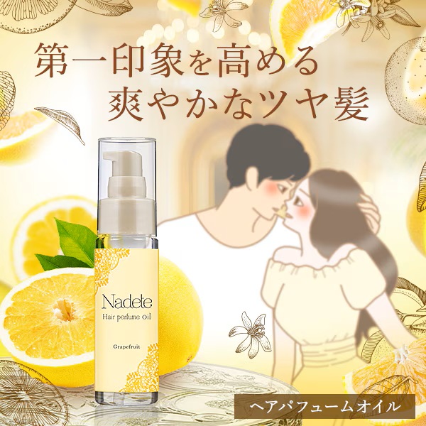 『ナデテ グレープフルーツ』は、みずみずしく爽やかな香りで若々しい印象を与え、思わず触れたくなるようなツヤ髪を叶えてくれる優秀なヘアパフュームオイルです。